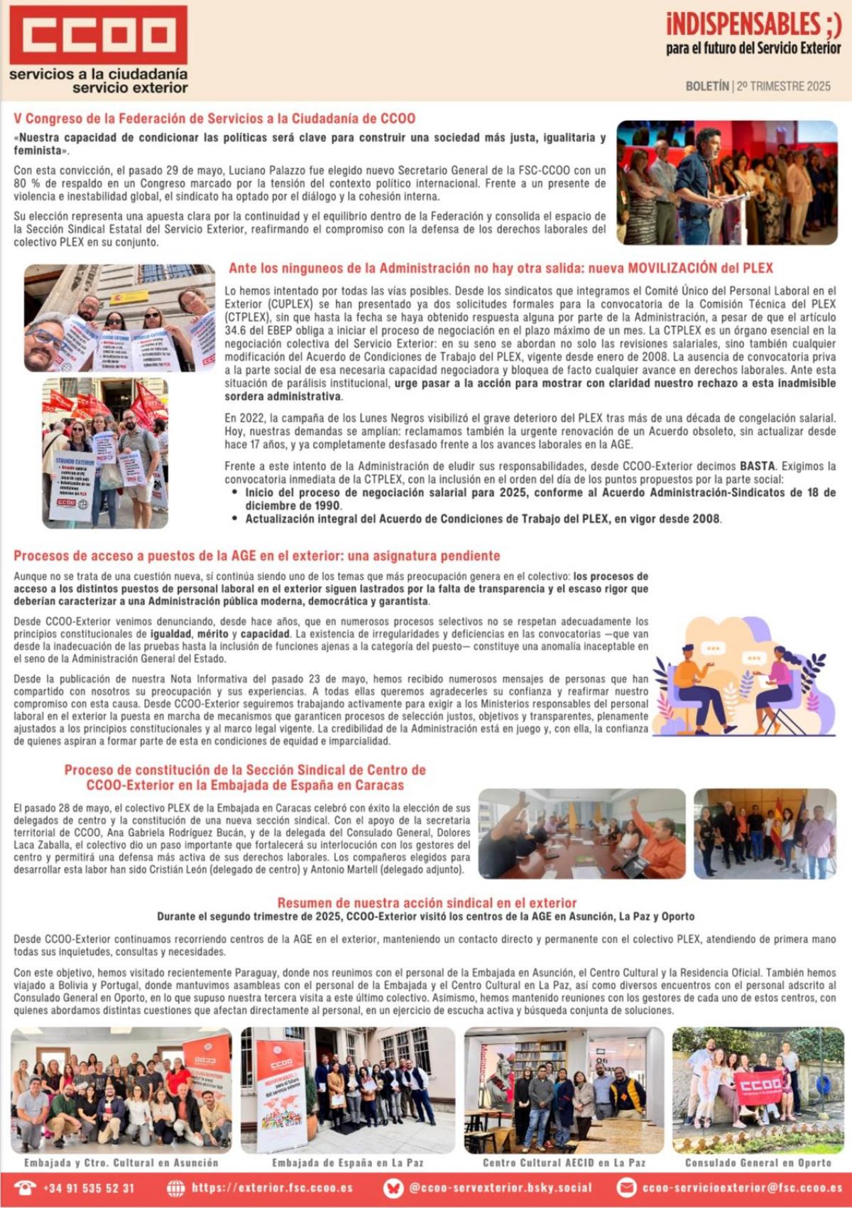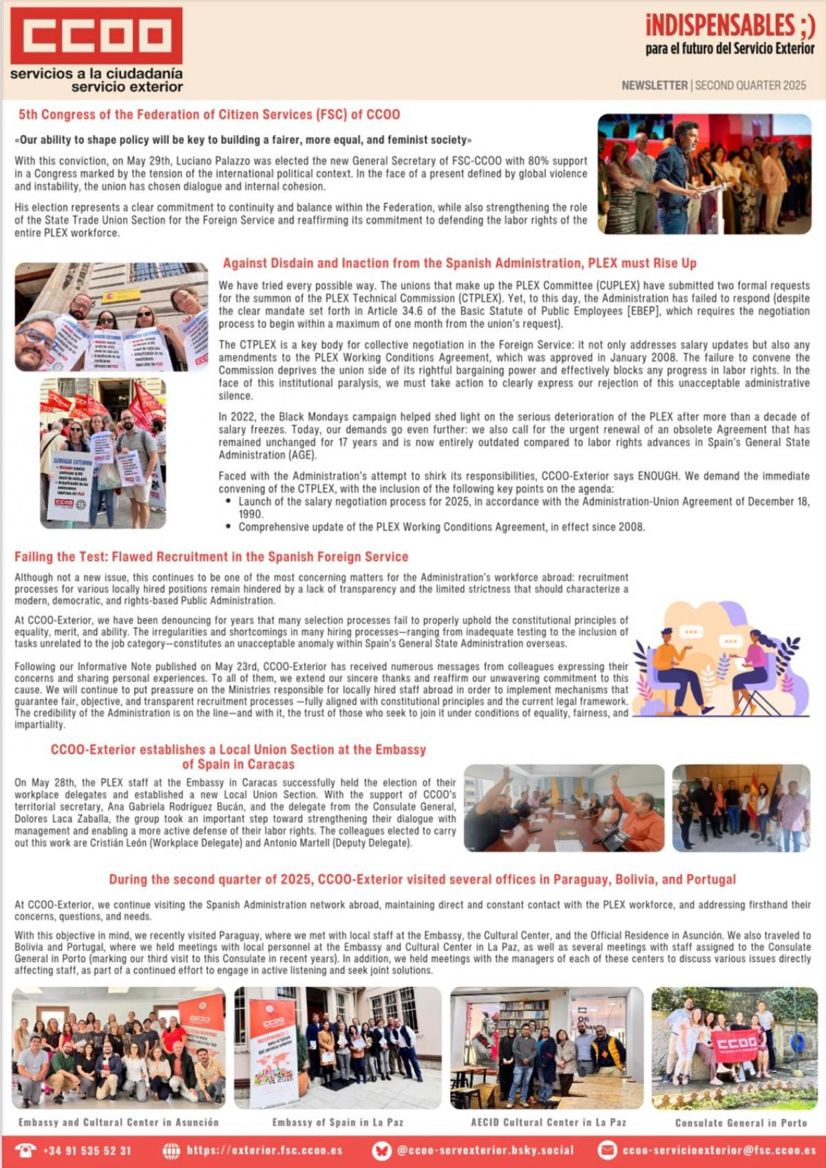 ✊ Luciano Palazzo elected new General Secretary of FSC-CCOO. | 📣 Immediate convening of the PLEX Technical Commission demanded. | 📝 Urgent renewal of the outdated 2008 Working Conditions Agreement. | 🗺️ Union visits to Asunción, La Paz, and Porto to meet staff needs. | 🏛️ New union section formed at the Spanish Embassy in Caracas. | 🔥 Upcoming PLEX mobilization: without unity, there is no progress.