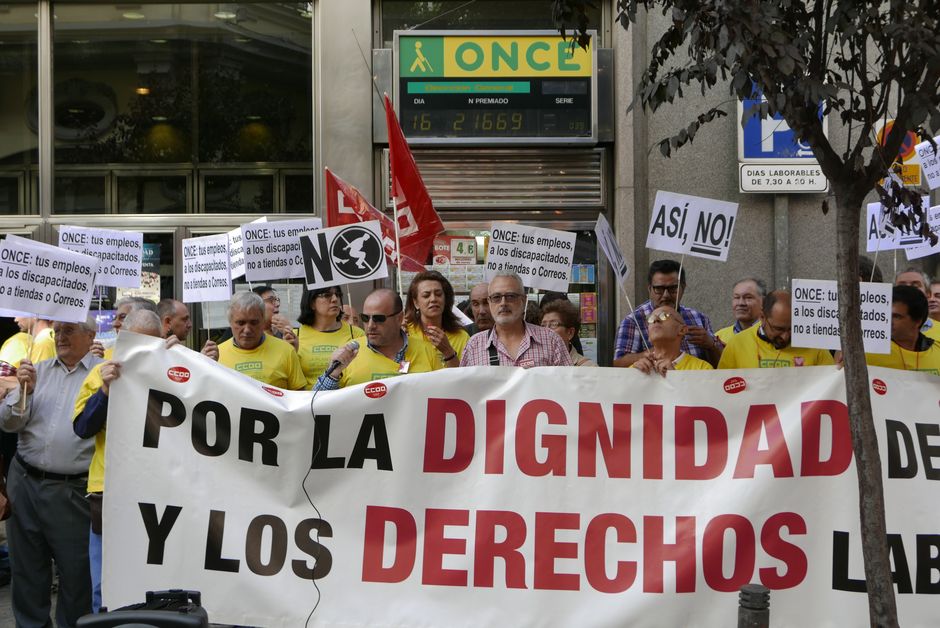 CCOO se ha concentrado ante la sede de la Dirección General de la ONCE para recuperar los objetivos fundacionales de esta entidad social. La Dirección de la ONCE está arrebatando la venta de sus juegos a la plantilla del personal vendedor de forma paulatina y descarada, trasladándolos al denominado Canal Físico Complementario (CFC), que engorda cada día. Empezaron con gasolineras y estancos, y hoy nuestros juegos ya se venden en supermercados y hasta en las oficinas de Correos.