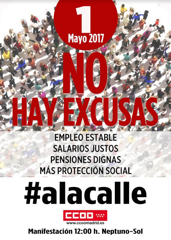Asimismo, en vísperas del 1º de Mayo, el sindicato hace un llamamiento a participar en los actos y manifestaciones convocadas por CCOO y UGT, en todo el país para exigir empleo estable, salarios justos, pensiones dignas y más protección social. Bajo el lema “No hay excusas”, ambas organizaciones quieren expresar su rechazo a las políticas de recortes que han empobrecido a la clase trabajadora, aumentado las desigualdades, la pobreza y la exclusión social; así como a la falta de compromiso de la patronal y Gobierno en las mesas de diálogo social, y unos PGE que no atienden las necesidades de la sociedad.