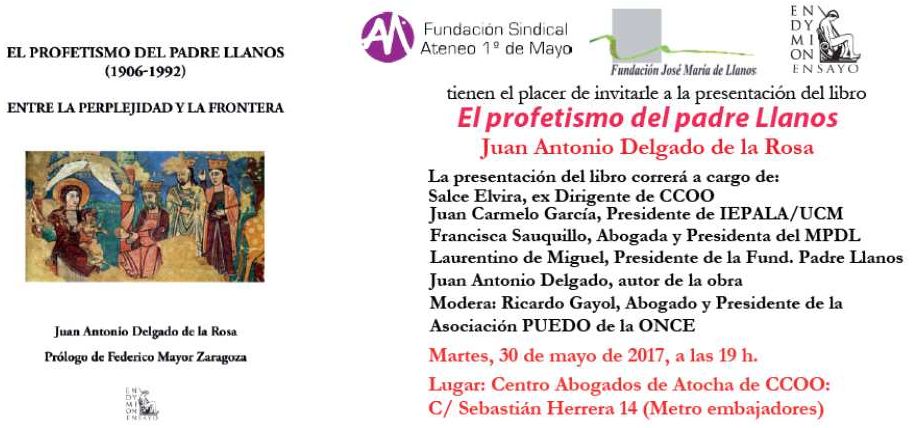 El libro de Juan Antonio Delgado de la Rosa será presentado por Salce Elvira, Juan Carmelo García, Francisca Sauquillo, Laurentino de Miguel y el propio autor el día 30 de mayo a las 19:00 horas en el salón de actos del Centro Abogados de Atocha (c/Sebastián Herrera, 12, 1º Planta). La entrada es libre hasta completar aforo.