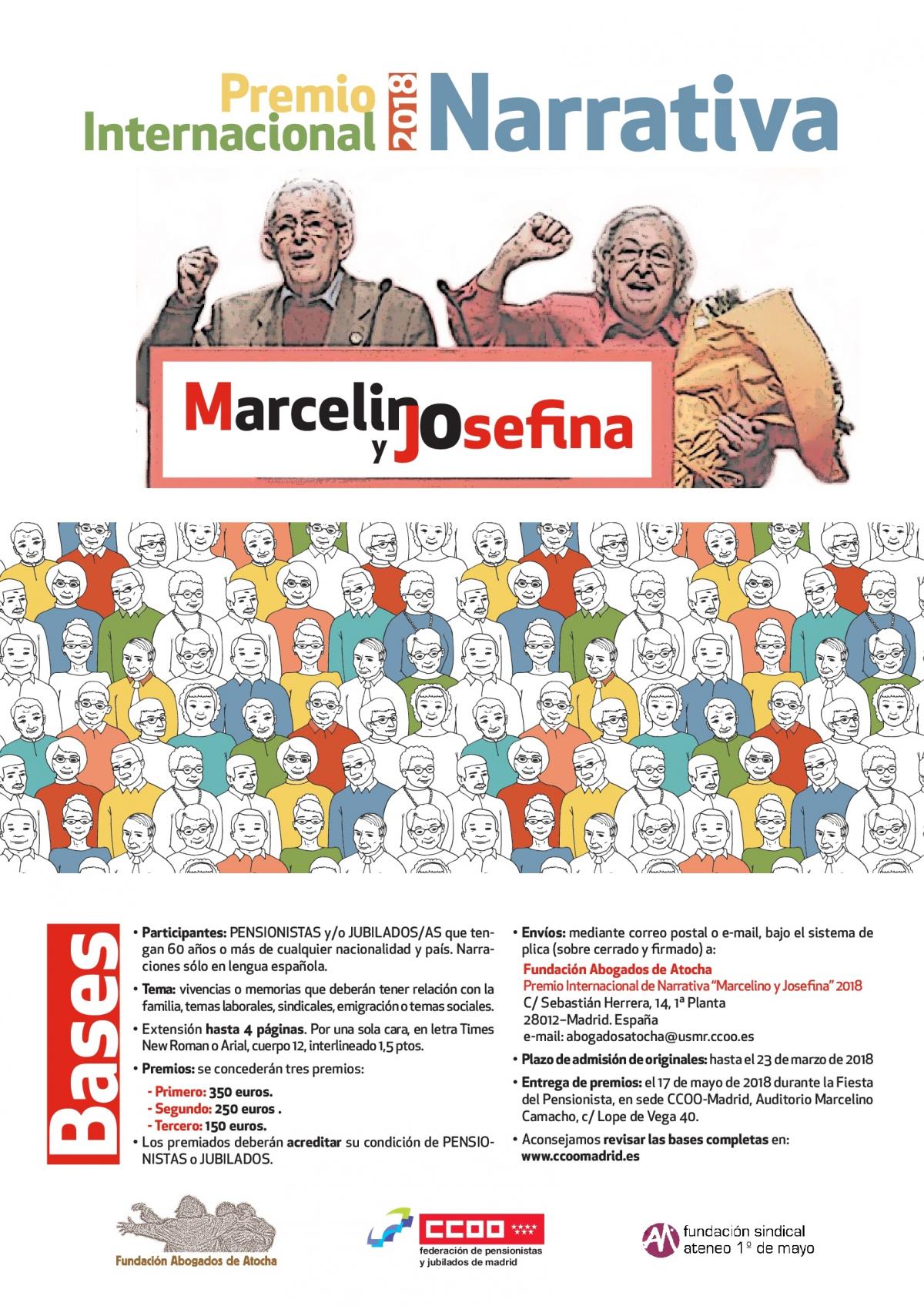 CCOO, a través de la Federación de Pensionistas y Jubilados, la Fundación Abogados de Atocha y el la Fundación Sindical Ateneo 1º de Mayo, ha convocado el Premio Internacional de Narrativa “Marcelino y Josefina”, dirigido a personas pensionistas y jubiladas que tengan 60 años o más, para que cuenten sus vivencias o memorias en relación con la familia, asuntos laborales o sindicales, emigración o temas sociales.
