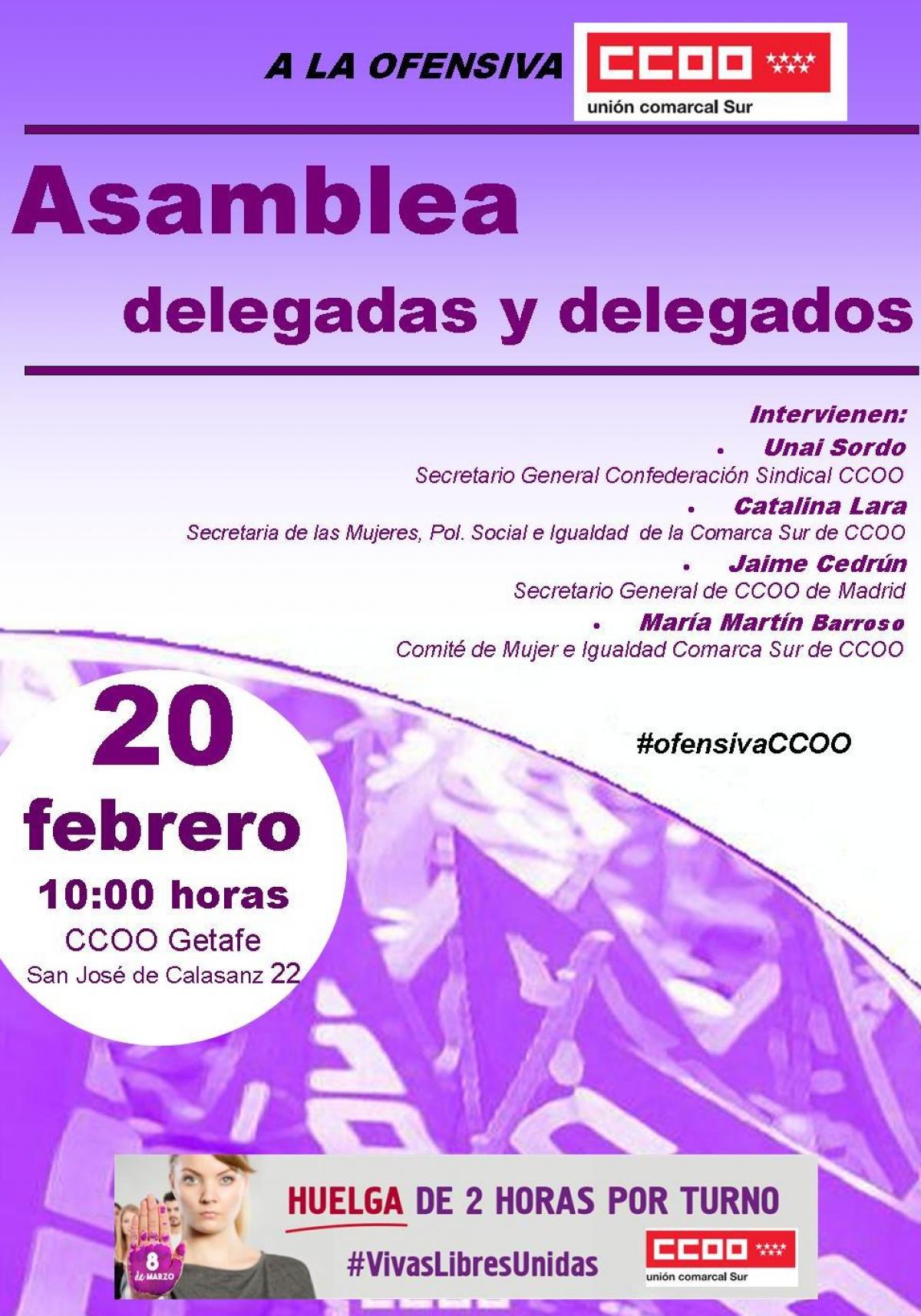 Mañana martes, 20 de febrero, a las 10 horas, en la sede de CCOO en Getafe (San José de Calasanz, 22), tendrá lugar una asamblea, con la participación de Unai Sordo, secretario general de la Confederación Sindical de CCOO; Jaime Cedrún, secretario general de CCOO de Madrid; Catalina Lara, secretaria de las Mujeres de la Unión Comarcal Sur de CCOO; y María Martín Barroso, del comité de mujer e igualdad de la Unión Comarcal Sur de CCOO.