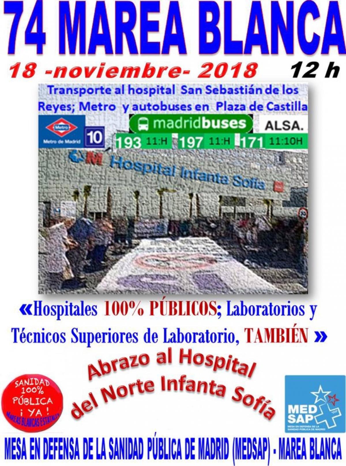 La Marea Blanca saldrá este domingo, 18 de noviembre, a las 12 horas, para “abrazar” el Hospital Infanta Sofía de San Sebastián de los Reyes (Madrid), con el lema: “Hospitales 100% públicos, laboratorios y técnicos superiores de laboratorio, también”.
