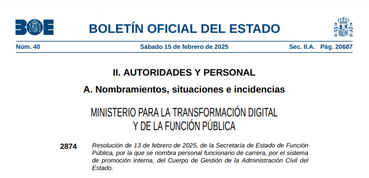 En el BOE del sábado, 15 de febrero de 2025, se ha publicado la Resolución de 13 de febrero de 2025, de la Secretaría de Estado de Función Pública, por la que se nombra personal funcionario de carrera, por el sistema de promoción interna, del Cuerpo de Gestión de la Administración Civil del Estado.