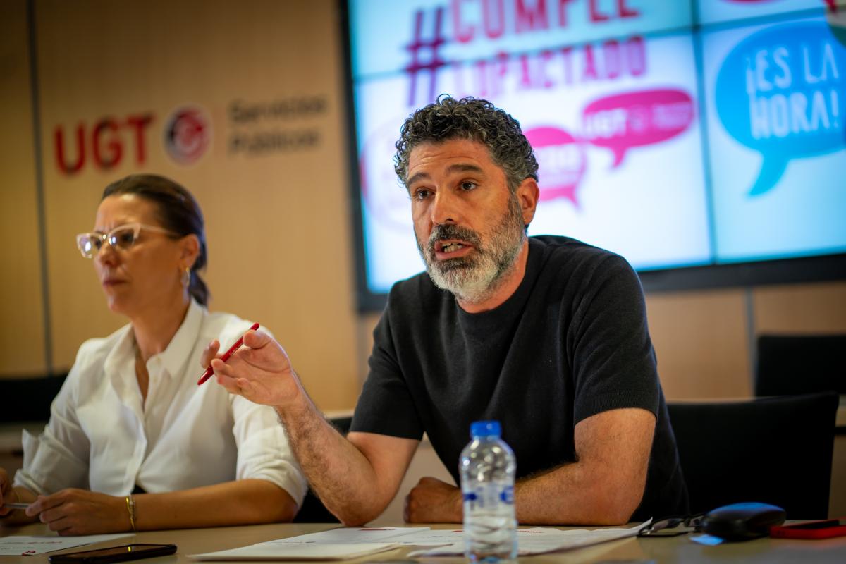 Isabel Araque Lucena, secretaria general de UGT Servicios Públicos, y Lucho Palazzo Gallo, coordinador del Área Pública de CCOO, han comparecido en rueda de prensa, tras el encuentro celebrado entre ambas organizaciones sindicales, para resaltar que, aunque esta semana se ha aprobado en Consejo de Ministros y publicado en el BOE el abono del 0,5% de 2024, la medida es tardía y claramente insuficiente.