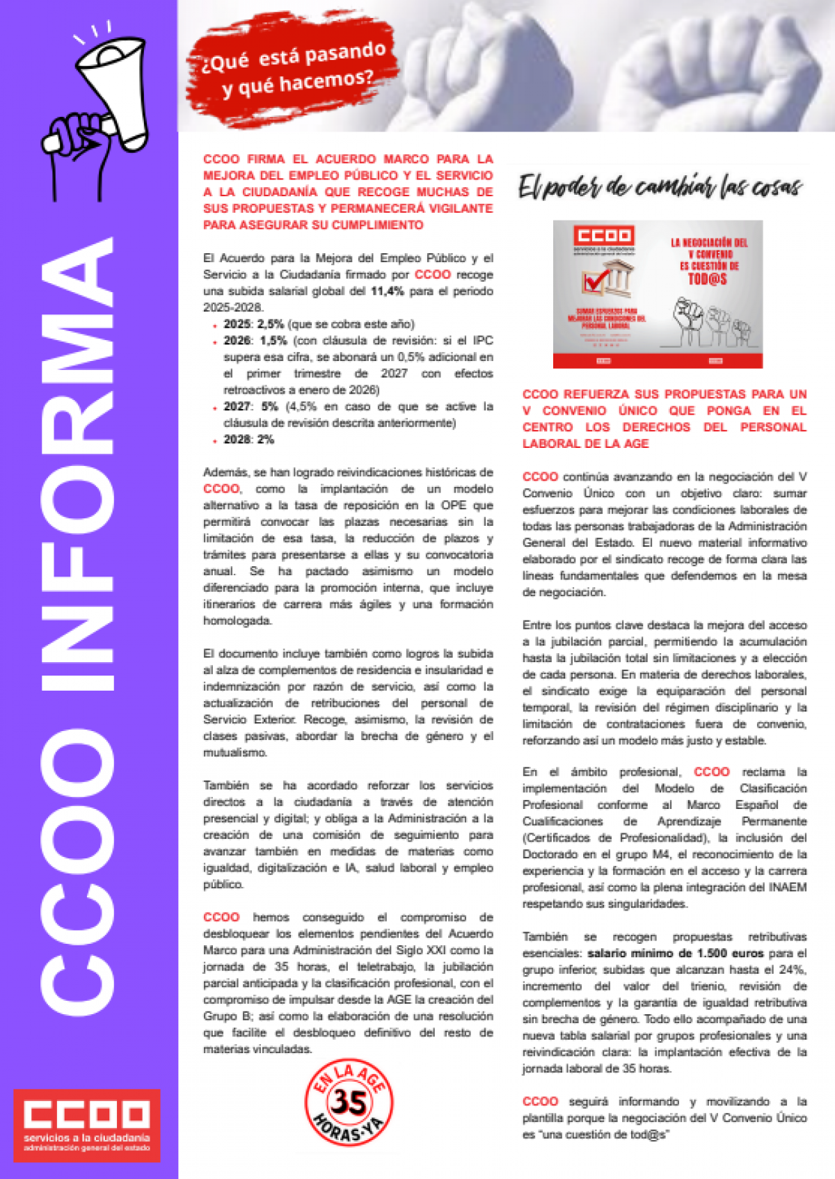 Además, CCOO ha logrado que se desbloqueen cuestiones pendientes del Acuerdo Marco para una Administración del Siglo XXI, entre ellas la jornada de 35 horas, el teletrabajo, la jubilación parcial anticipada y la clasificación profesional, incluyendo el impulso al Grupo B.