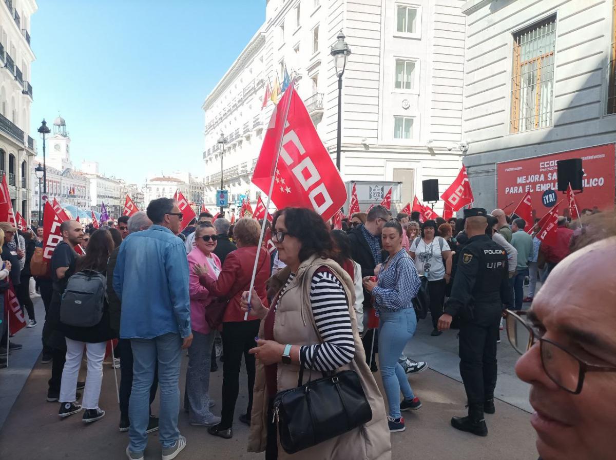 Mani de CCOO el 8 de abril de 2025 a la puerta del Ministerio de Hacienda en la Puerta del Sol de Madrid