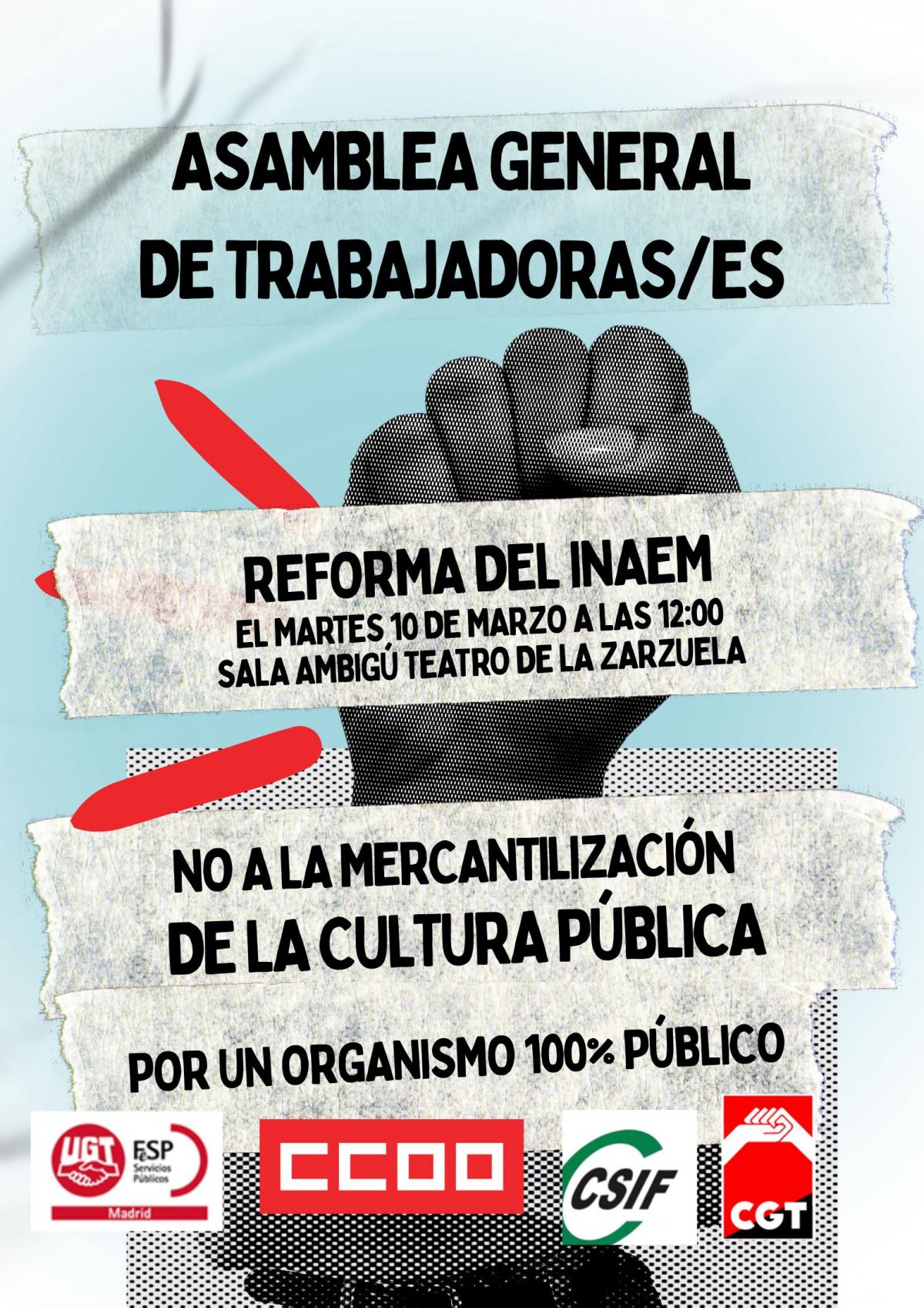 Se informa a toda la plantilla sobre la celebración de una Asamblea General conjunta, convocada por los sindicatos UGT, CCOO, CSIF y CGT, para tratar el proyecto de reforma del INAEM.